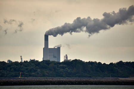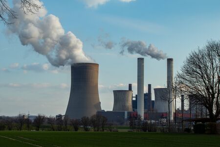 Jüchen, Germany - April 12, 2019: air pollution from the chimney of a power plant burning coal