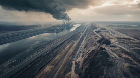 a power plant juxtaposed against an open-cast coal mine in an aerial view, the interplay between industrial infrastructure and natural elements