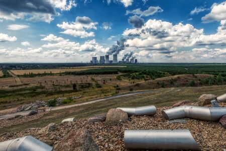 A view of the smoking chimneys of a distant coal-fired power plant on the horizon. Photo taken in natural daylight, late afternoon.