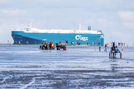 Cuxhaven, Germany - Aug 25, 2019: equestrian at the horse race in the mud flat at Duhner Wattrennen in Germany