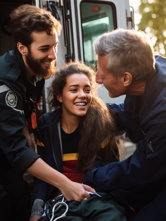 A female paramedic in uniform is treating an injured man with a cut on his face. They are sitting on the back bumper of an ambulance, and the paramedic is showing him a first-aid kit. This image represents emergency services, medical care, and first responders.