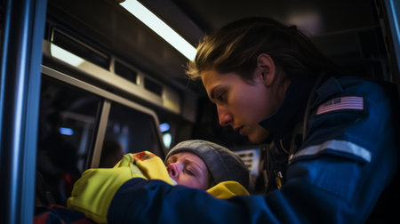 Focused female EMT providing care in an ambulance, illustrating emergency medical response.