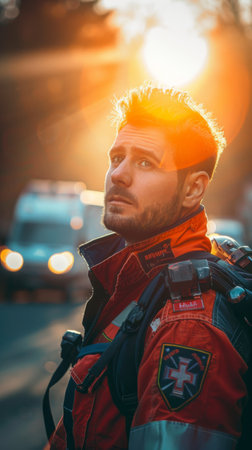 A man wearing a navy blue uniform stands in front of a white and red ambulance with flashing lights. The man appears to be a paramedic or emergency medical technician.