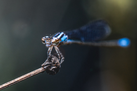 Dragonfly sitting on the stem of the plant. This insect lives near water bodies.