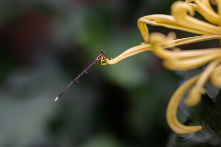 A orange damselfly perched on a tree branch and nature background, Selective focus, insect macro, Colorful insect in Thailand.
