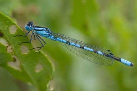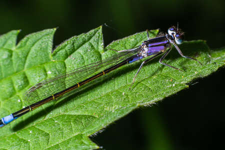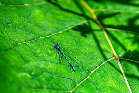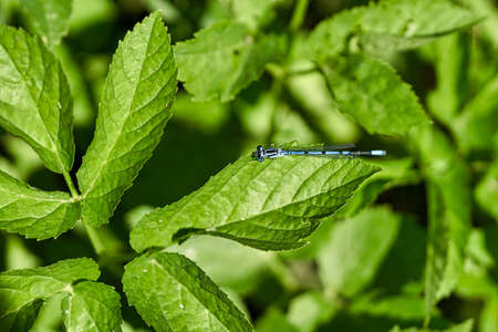 A Common blue damselfly resting on a leaf, sunny day in summer