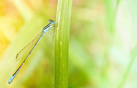 Blue dragonfly sits on a green blade of grass close-up. Macro photo. The concept of summer, insects. Copyspace.