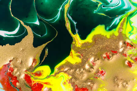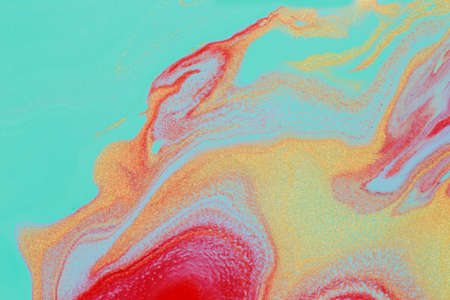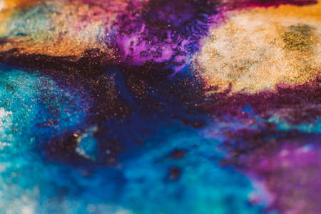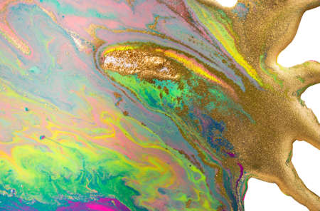 Fluorescent colorful liquid inks background with gold glitter particles. Marble imitation.