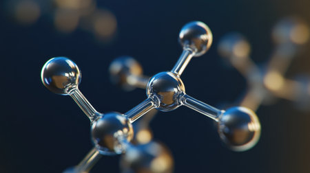 This image showcases a molecular structure composed of interconnected spheres and rods, set against a dark backdrop. The structure is rendered with a glossy appearance, highlighting the connection points. A bokeh effect in the background adds depth. Suitable for scientific publications, educational materials, or use in technology-related projects.