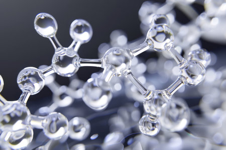 Dark glossy molecular bonds and spheres against a moody, textured background with soft light.