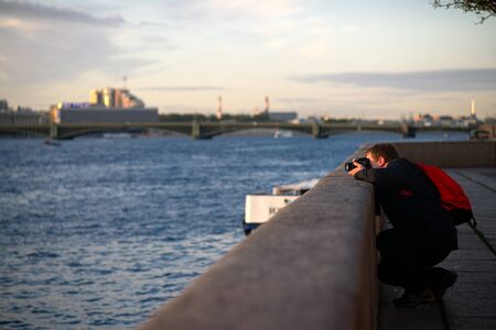 Man tourist photographs from embankment in St. Petersburg, Russia