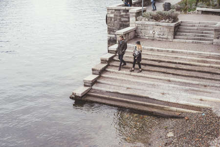 High angle view of young couple strolling down harbour stairs, Lake Como, Italy