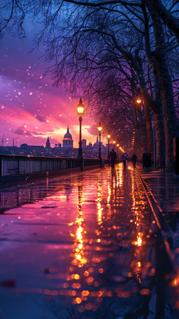 This image features a blurred urban scene at dusk. The low-angle perspective shows a waterfront with wet paving stones reflecting the colorful sunset. The composition includes buildings and lights that are out of focus. It could be used in design projects, websites, or editorial publications.