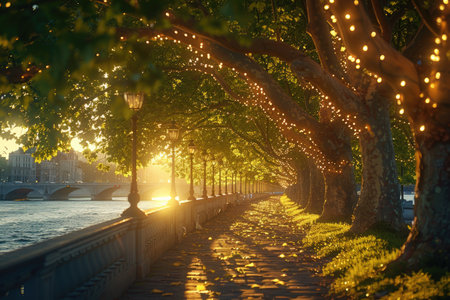Scenic riverside promenade with park benches and city skyline at sunset. Relaxing urban environment