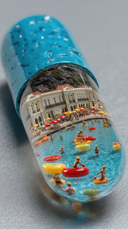 Capsule features a detailed miniature swimming pool scene with people on floats, sunbathing, and enjoying summer fun, creating a whimsical and lively atmosphere