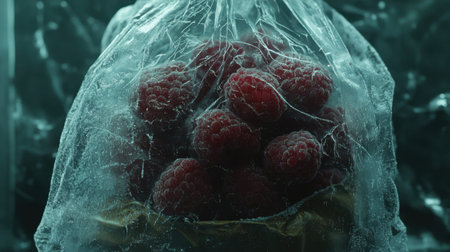 A striking image of frozen raspberries encased in a clear plastic bag, showcasing intricate ice crystals against a dark background, evoking freshness and quality.