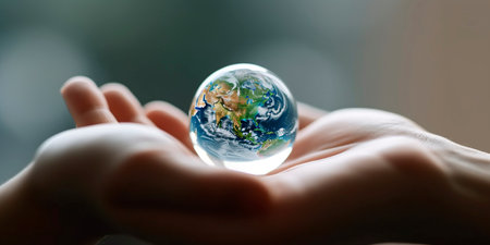Earth depicted as a transparent glass globe, with cracks and imperfections symbolizing the planet's vulnerability to human actions