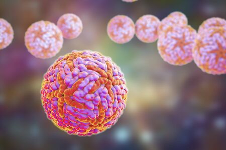 Hepatitis A viruses HAV, 3D illustration. HAV infect humans through contaminated water, food and dirty hands, then through intestine they come to liver and cause hepatitis