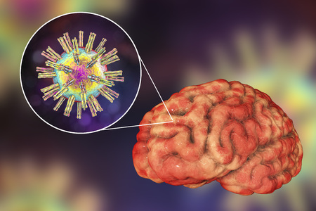 Herpes virus encephalitis, medical concept, 3D illustration showing brain infection and close-up view of Herpes viruses in the brain