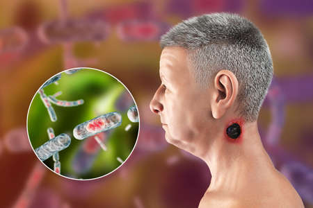 Cutaneous anthrax, the most common form of anthrax. 3D illustration showing the characteristic black eschar on the neck skin and closeup view of bacteria Bacillus anthracis