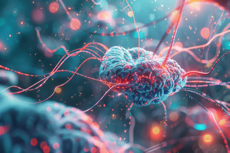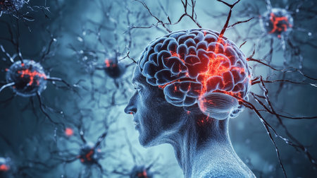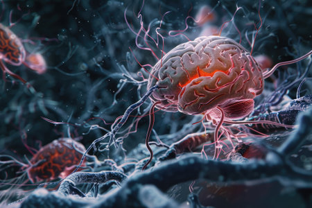 Vivid depiction of a brain with encephalitis, featuring glowing neural connections