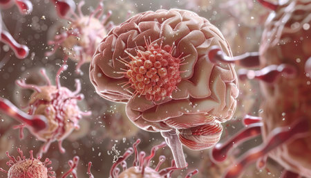 Medical illustration of cancer cell consuming brain tissue, high detail, educational