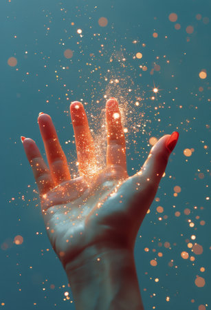 A single hand reaches up through water with glistening, light-catching particles surrounding it.