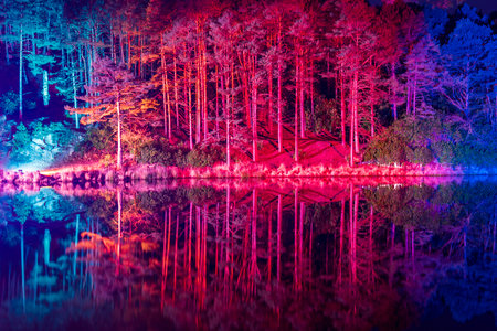 A stunning pathway through a lush forest illuminated by vibrant lights, creating a magical atmosphere filled with color and tranquility, perfect for exploration and adventure.