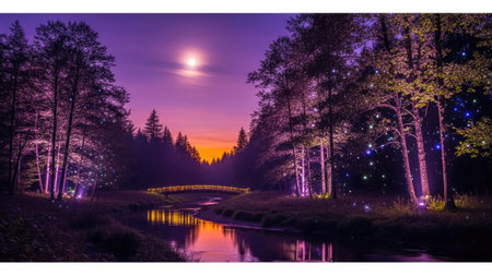 Enchanting twilight forest scene with glowing vibrant foliage tranquil streams and misty ethereal reflections creating a fairytale like atmosphere of wonder and adventure