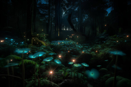 A tranquil forest illuminated by countless glowing mushrooms and sparkling lights. The enchanting scene captures a serene and dreamlike ambiance.