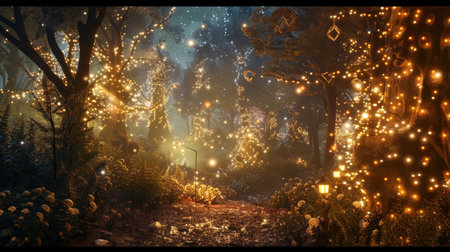 A garden pathway adorned with fairy lights creates a magical ambiance, Fantasy fairy garden with delightful and vibrant colors for a birthday theme, AI Generated