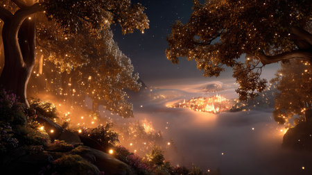 Discover a magical forest scene at night, featuring glowing lights amidst a misty landscape that evokes tranquility and wonder.