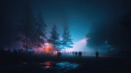 A captivating night scene showcasing silhouetted figures amidst dense fog and colorful lights. The atmosphere evokes a sense of mystery and adventure in nature.