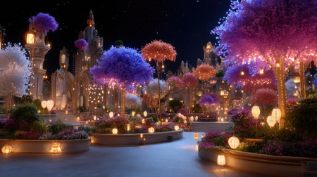 Stunning pathways adorned with glowing lanterns create a magical atmosphere amid blooming flowers.