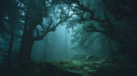 A serene and mysterious forest landscape with tall trees and green undergrowth shrouded in mist