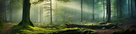 Foggy Forest Mystique Ancient moss-covered trees emerge from dense morning fog in primeval woodland. Sun rays penetrate the mist creating