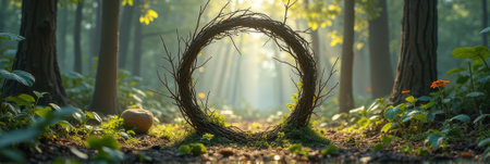 Enchanted forest circle of twigs in sunlit woodland scenery. That the image is generated using AI.