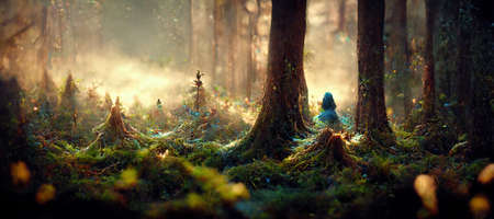 Fantasy fantasy forest with fog and light. 3D illustration.
