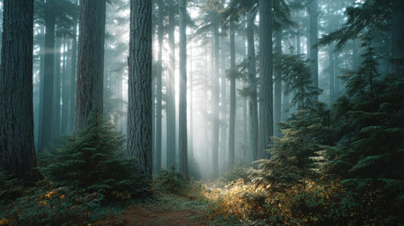Discover a captivating forest scene, showcasing towering trees enveloped in mist. The fog creates an ethereal atmosphere, highlighting nature's calm and beauty.