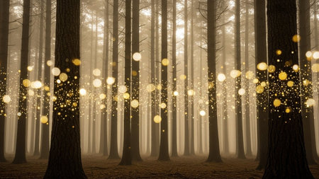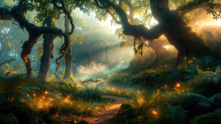 Enchanted forest with glowing fireflies and sunlight through ancient trees.