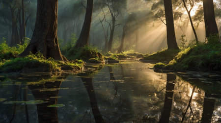 Sunbeams pierce a mystical forest, illuminating lush greenery. Peaceful nature.