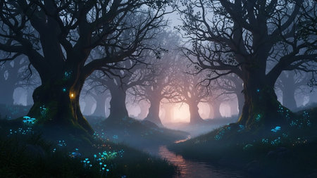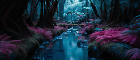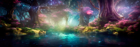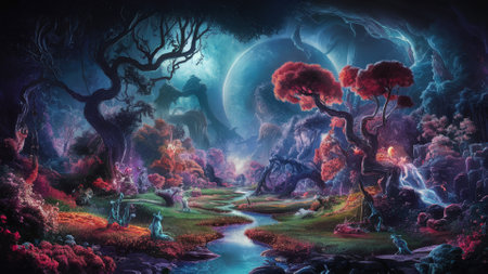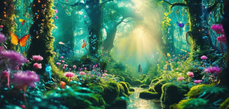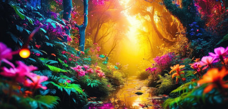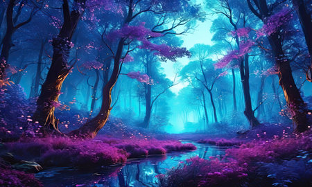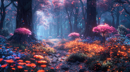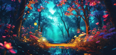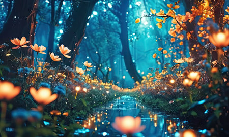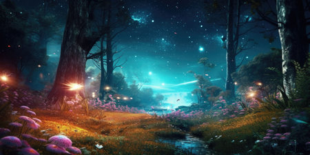 Enchanted Forest with Fields of Luminescent Flowers and Sparkling Streams in a Mystical Fairytale like Landscape Serene Tranquil and Captivating Dreamy Nature Scene
