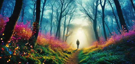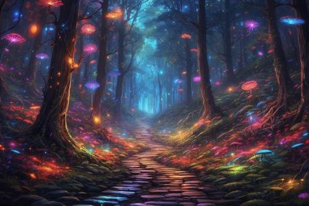 Enchanted Glowing Forest Path with Vibrant Luminous Foliage and Dreamlike Atmospheric Scenery