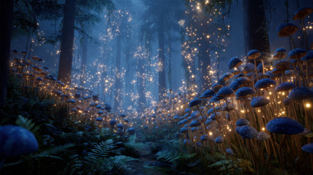 A tranquil forest illuminated by countless glowing mushrooms and sparkling lights. The enchanting scene captures a serene and dreamlike ambiance.