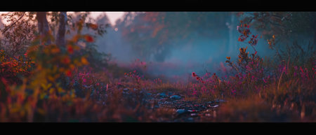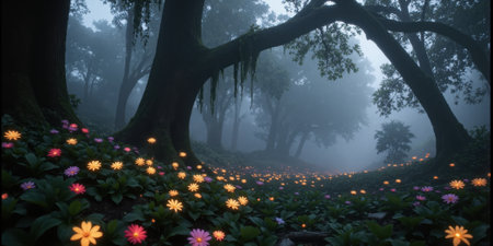 Whimsical Fairytale Flowers in a Misty Forest A whimsical, fairytale-inspired scene featuring colorful flowers that appear to glow
