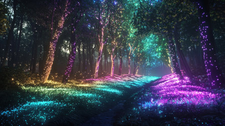 A stunning pathway through a lush forest illuminated by vibrant lights, creating a magical atmosphere filled with color and tranquility, perfect for exploration and adventure.