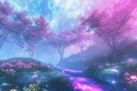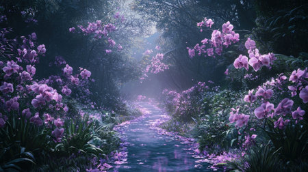 Luminous Orchid Path A serene and enchanted forest landscape with a winding path surrounded by glowing orchids and lush foliage creating a magical and tranquil atmosphere