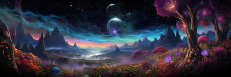 Mystical fantasy landscape with river and stars.