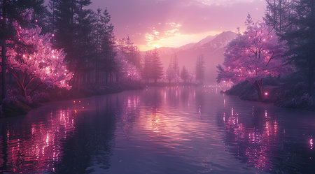 Lush pink trees line a serene stream flowing through a colorful, ethereal landscape at twilight.