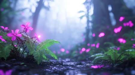 A captivating image of a forest with vibrant pink flowers, lush green ferns, and a soft, ethereal light filtering through the trees, creating a magical atmosphere.